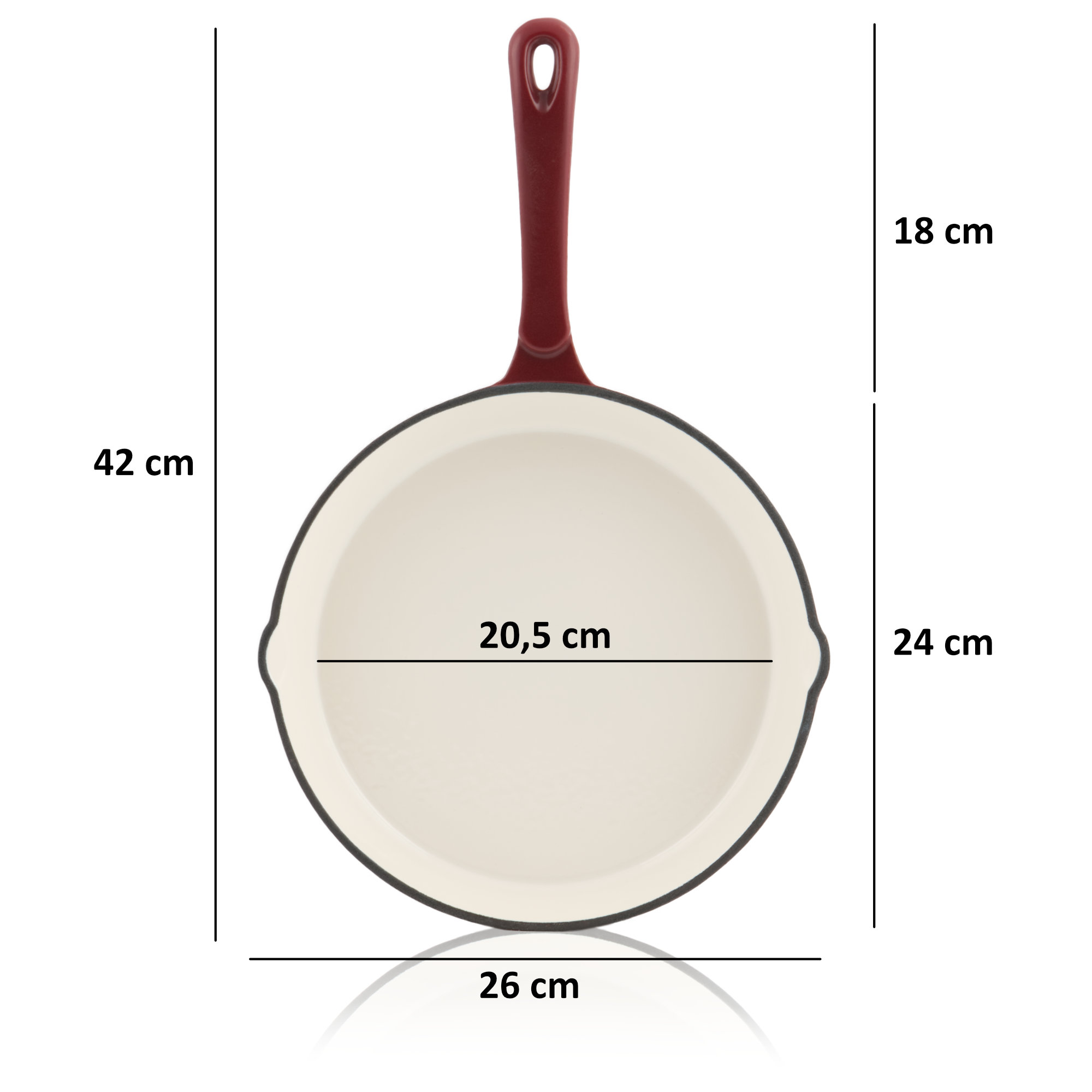 Das 3-teilige Gusseisen Set besteht aus: 1x Gusseisen Bratpfanne (Ø 24 cm), 1x Gusseisen Auflaufform (1,6 Liter) und 1x Gusseisen Bräter mit Deckel (4,8 Liter).