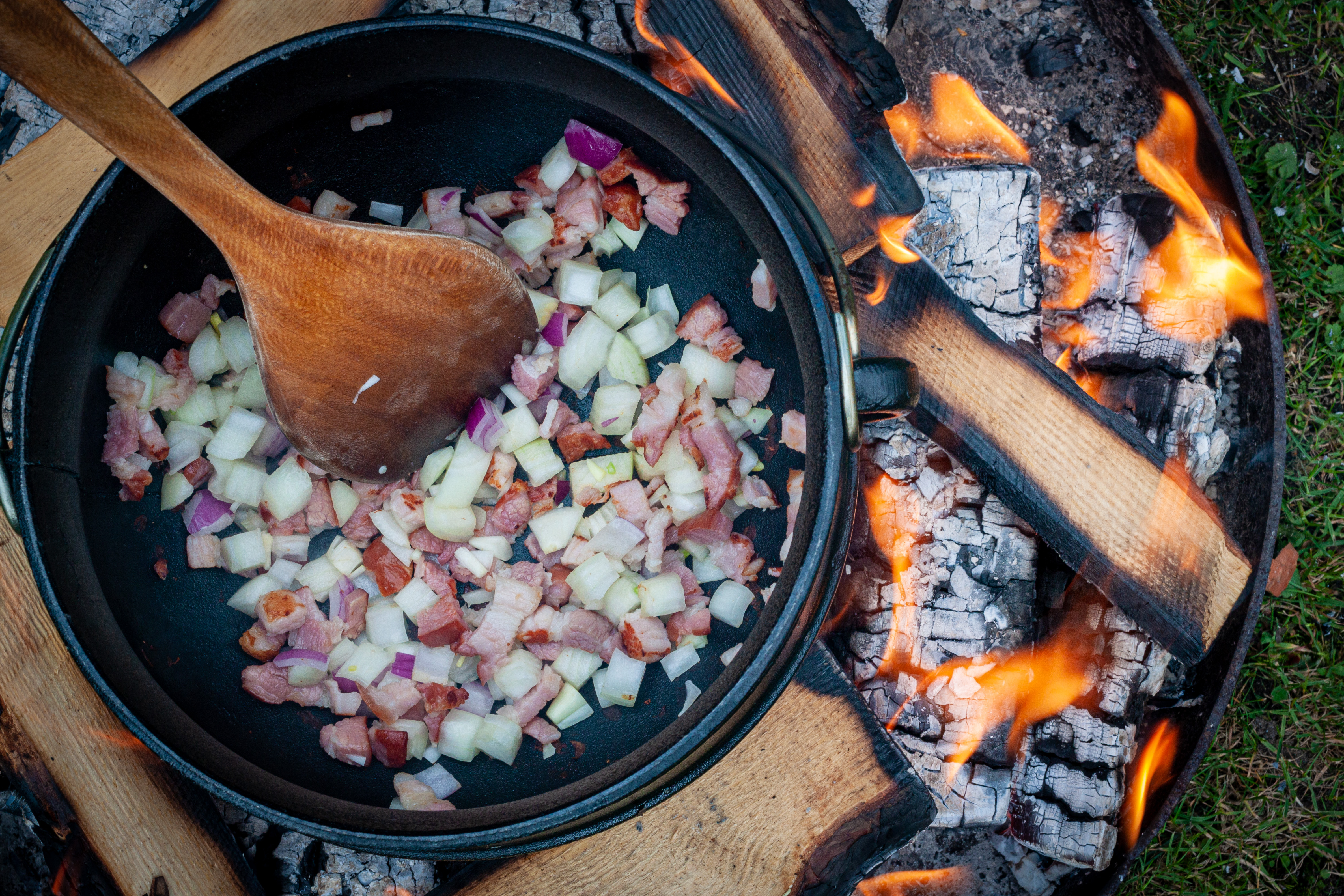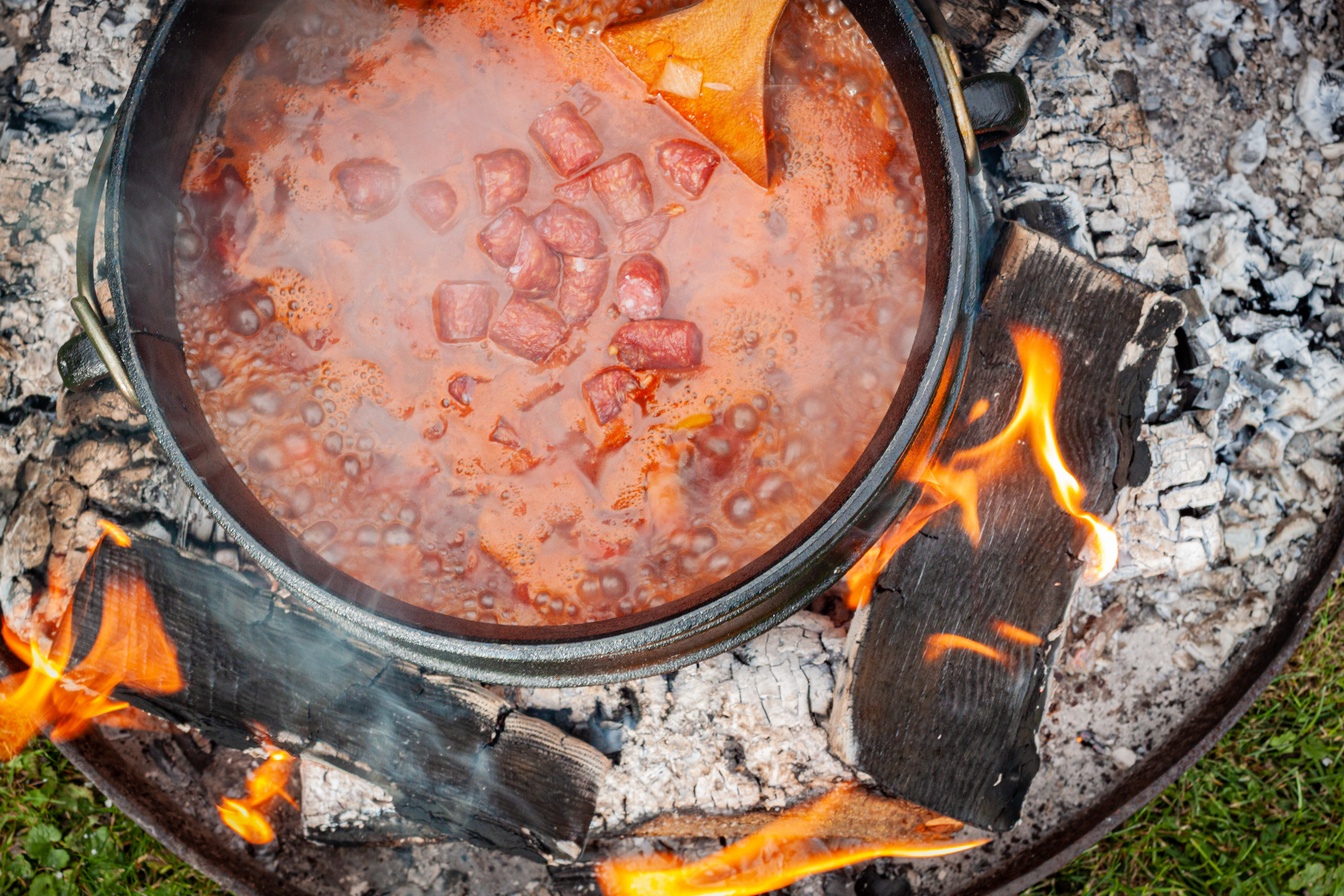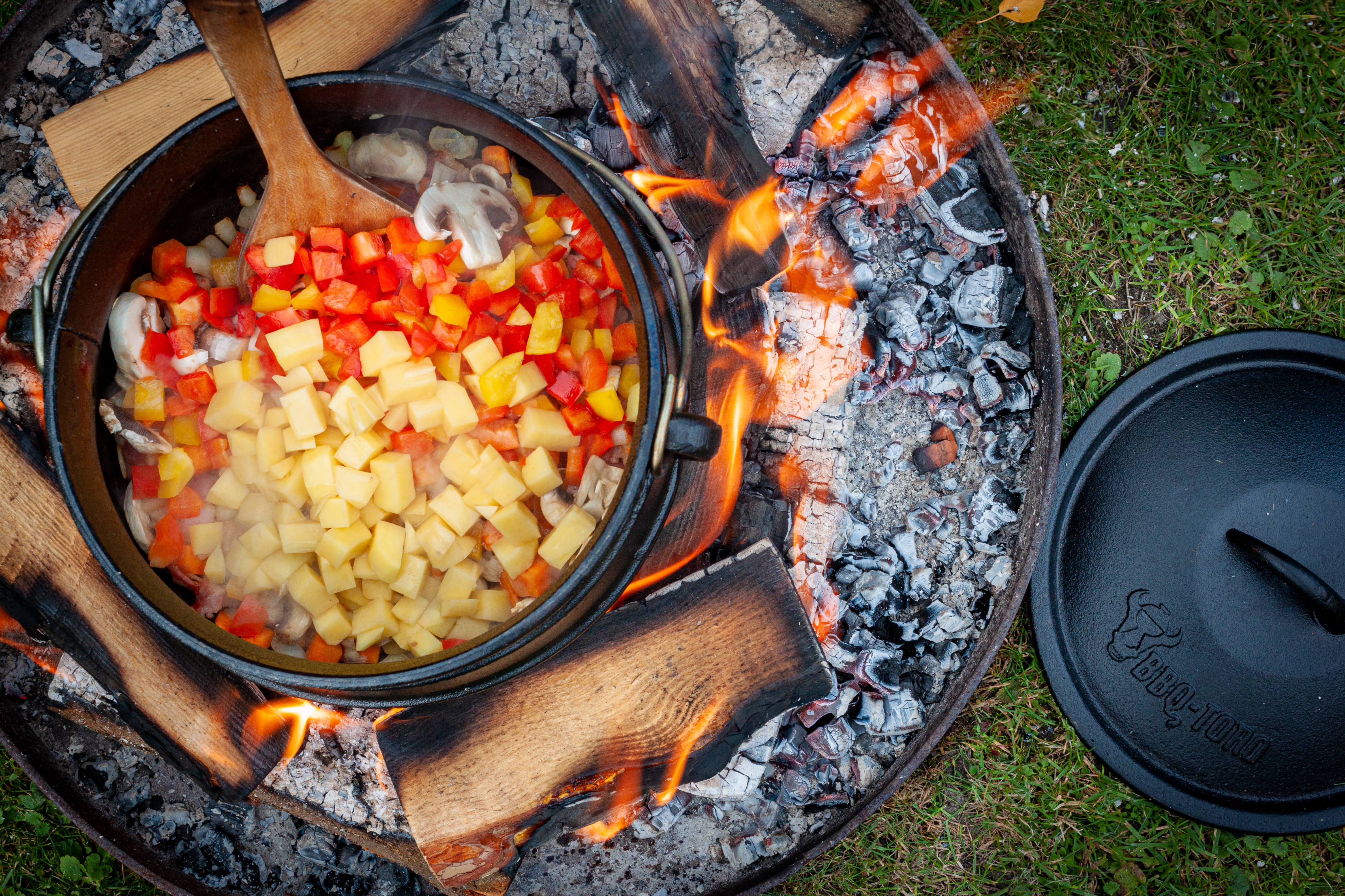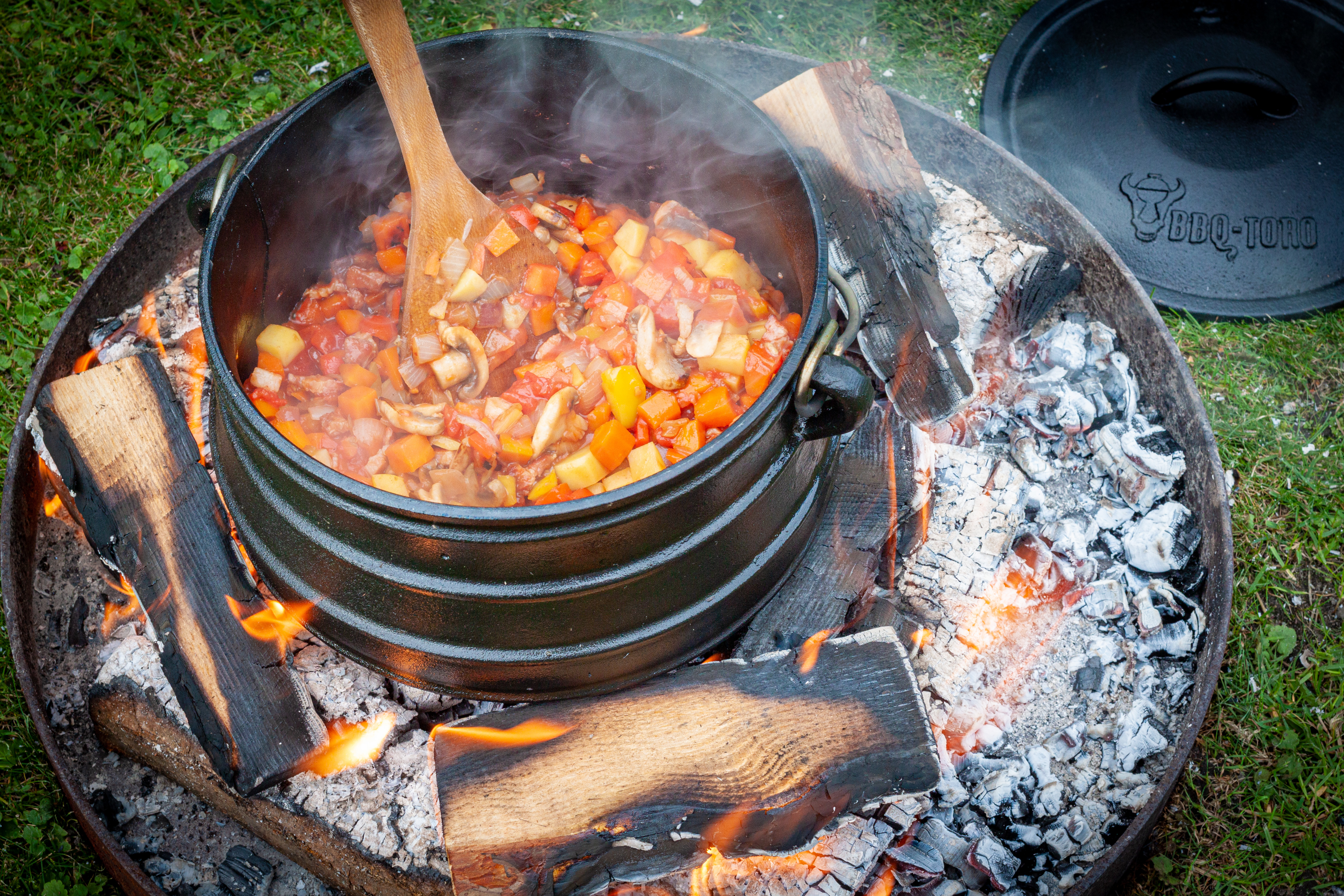 Der Potjie hat große Ähnlichkeit zum typischen Dutch Oven. Er besteht aus Gusseisen, sodass man ihn überall verwenden kann: über Gas, Kohle oder ganz einfach über dem offenen Feuer - dieser Topf hält alles aus. Der exakt passende Deckel sorgt dafür, dass man in diesem Topf perfekt Gerichte schmoren kann. Gusseisen speichert die Wärme ideal und gibt diese gleichmäßig an das Essen weiter. Dieser leckere Bauerneintopf schmeckt natürlich auch in einem üblichen Topf - auf dem offenen Feuer ist das Erlebnis aber viel besser!