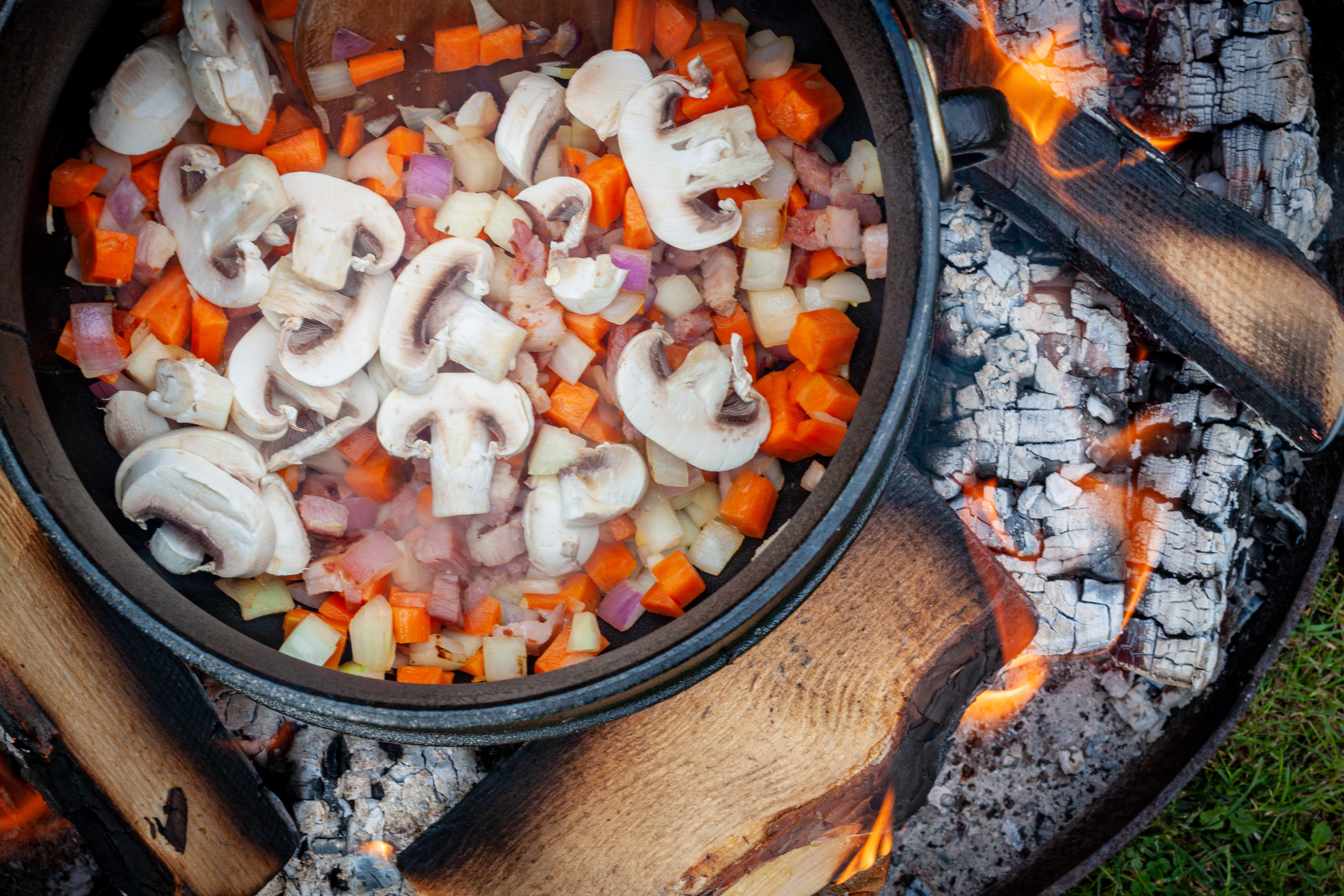 Nun einen Potjie oder Dutch Oven erhitzen - entweder über einem Lagerfeuer, über Kohlen oder auch Gas. Die Speckwürfel darin anbraten, bis sie Farbe angenommen haben. Nun die Zwiebeln dazugeben, danach Kartoffeln, Möhren und Paprika. Die Hälfte des Öls hinzugeben und etwa 5 MInuten braten lassen. Danach kommen die Pilze dazu, passierte Tomaten, Rotwein und Salzwasser. Den Deckel des Potjies schließen und alles für 15 Minuten köcheln lassen.