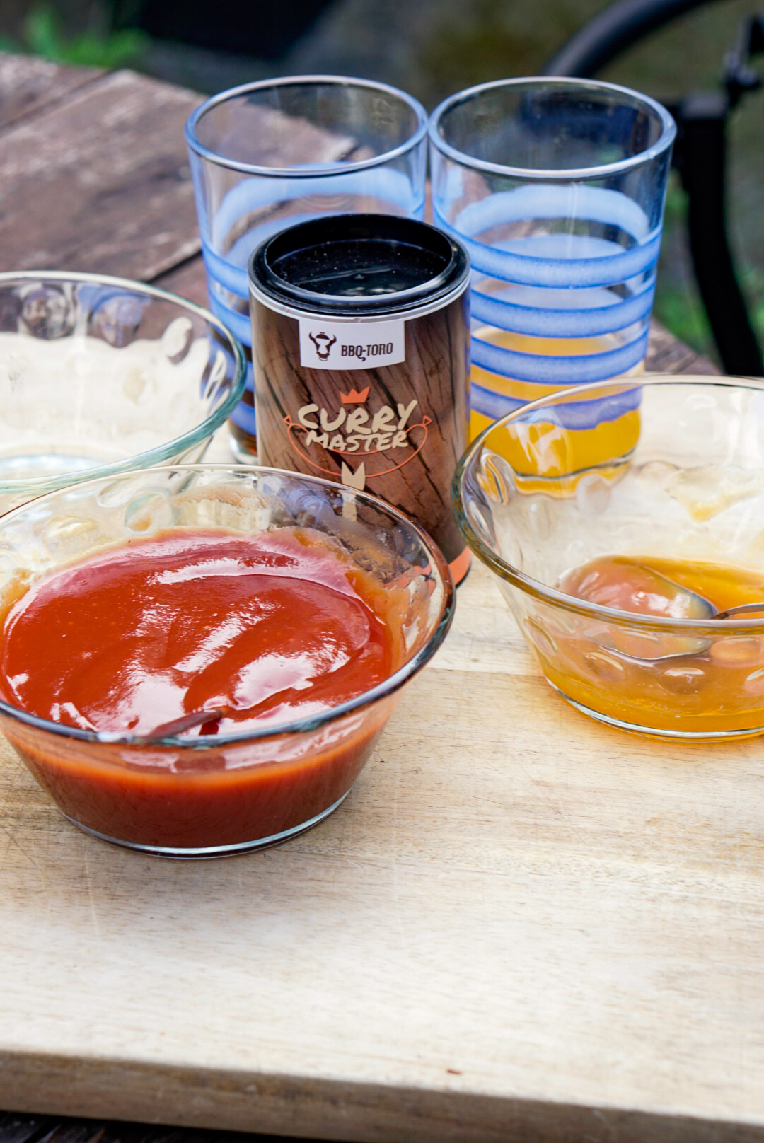 Das Öl, Ketchup, Orangensaft, Cola und die Marmelade in einem Gefäß auf dem Grill erhitzen und zwei Minuten köcheln lassen.