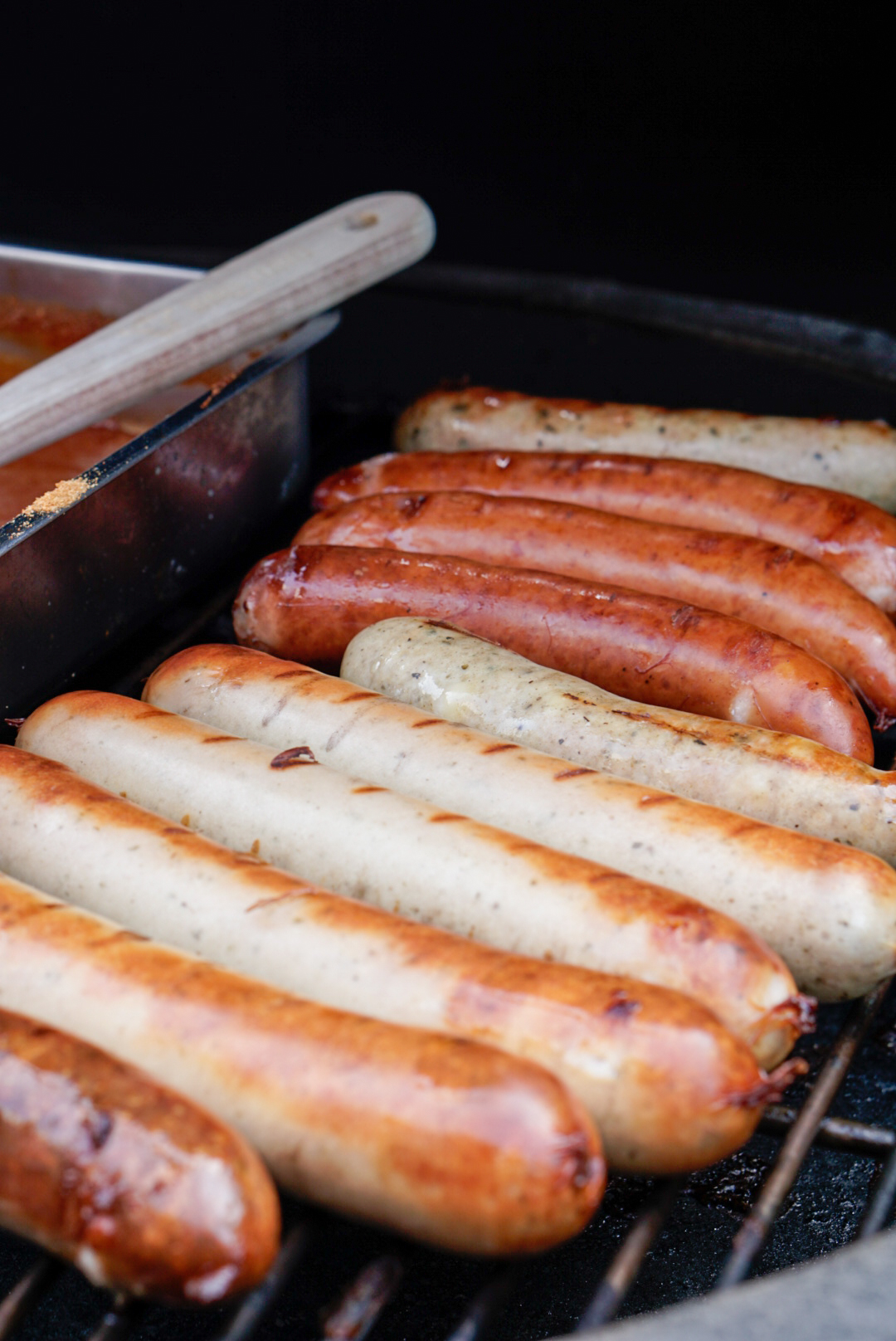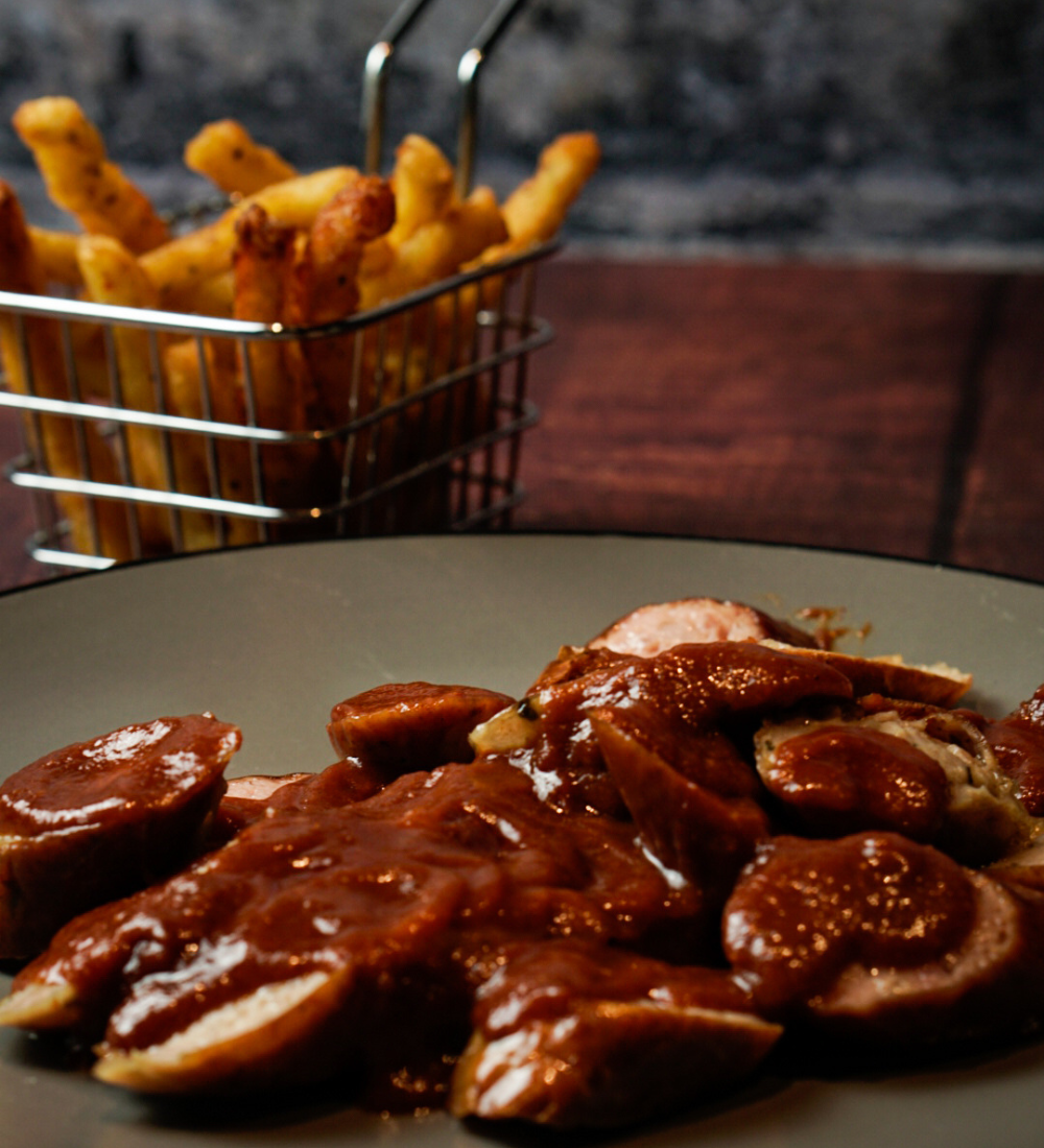 In der Zwischenzeit die Grillbratwürste rundum grillen. Die Würste in Scheiben schneiden und mit der Currysauce beträufeln. Mit